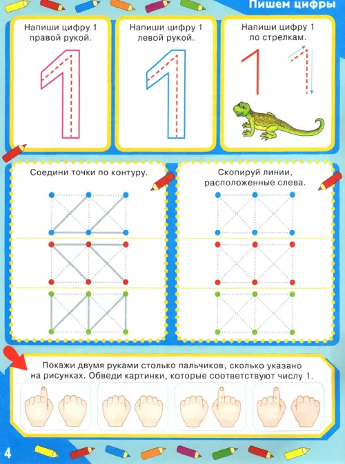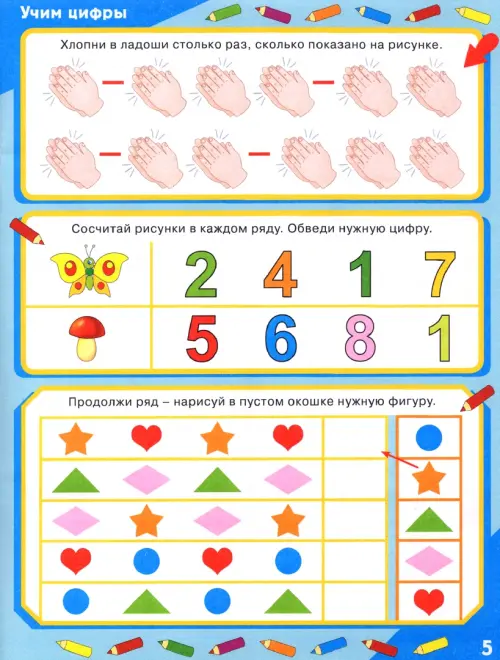 Занимаясь по этой книге, ребенок освоит счет до десяти, научится писать цифры, потренирует мышление, внимание и память. Помимо привычных заданий (прописывание как целой цифры, так и ее отдельных элементов, раскрашивание и обводка), здесь вы найдете упражнения на развитие ритма, на нахождение цифр среди наложенных изображений, на соотнесение определенного количества предметов с цифрой, что значительно повысит эффективность занятий.