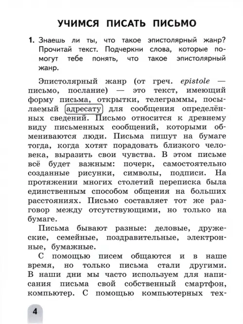 Пособие направлено на развитие умений работать с текстом, на развитие письменной речи младших школьников, на формирование умения самостоятельно изложить собственные мысли, наблюдения, переживания, суждения, формирование умений анализировать готовый текст, на развитие логического мышления. Содержание направлено не только на обучение работе с текстом, пересказу, написанию сочинений и изложений, но и на самовыражение учащегося, для этого представлены личностно ориентированные задания. Оригинальные, современные подходы к развитию устной и письменной речи, составление собственных высказываний, текстов разных стилей и жанров: текста-описания, текста-повествования, текста-рассуждения, роль читателя, автора и редактора произведения создаст интерес обучающимся к творческой работе с текстами.