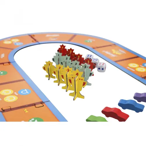 В наборе: картонная гоночная трасса из 10 частей; 4 планшета игроков; 18 карт испытаний; 12 трофеев; 4 деревянных фишки игроков; 12 деревянных маркеров прокачки; 3 игровых кубика; 4 карты для выставления трофеев; правила игры.
