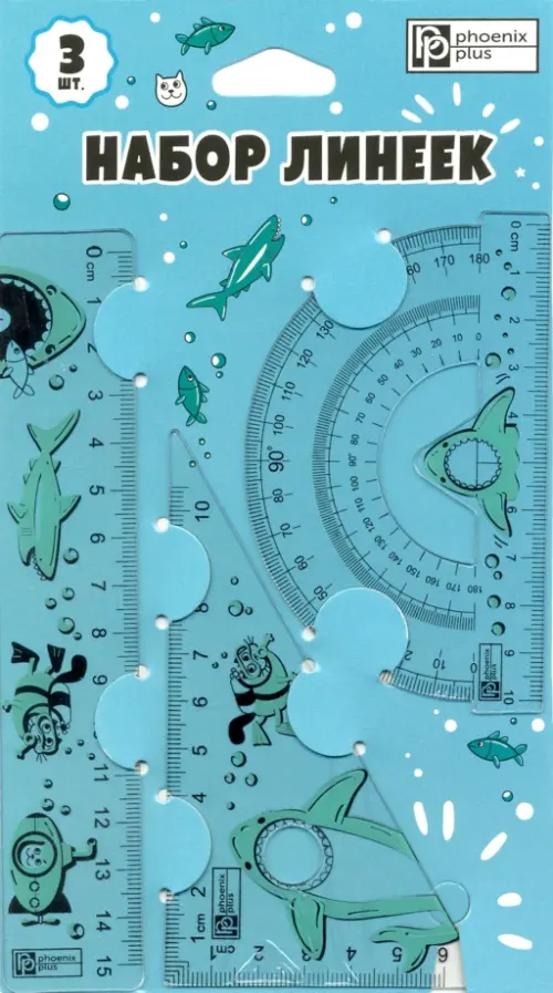 Комплектность: линейка, транспортир, треугольник с углом 60 градусов.