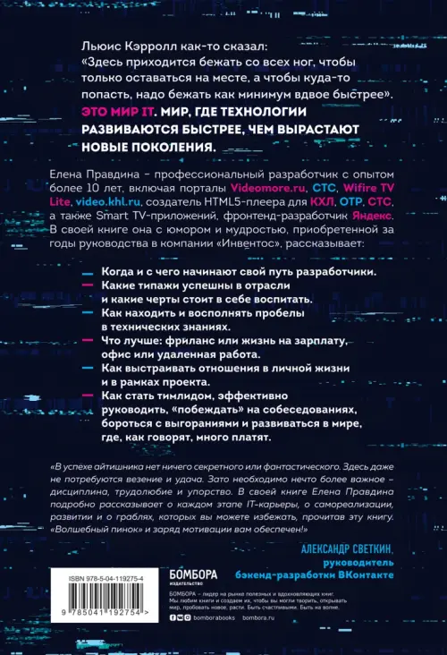 Если вы обнаружили ошибку в описании товара «Говорят, в IT много платят. Как построить успешную карьеру разработчика, оставаться востребованным» (авторы: Правдина Елена Владиславовна), то выделите её мышкой и нажмите Ctrl+Enter. Спасибо, что помогаете нам стать лучше!