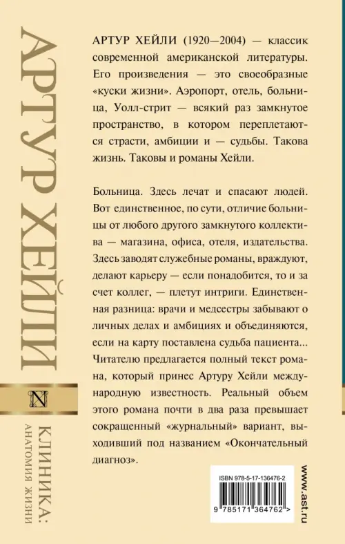Читателю впервые предлагается полный текст романа, который принес Артуру Хейли международную известность. Реальный объем этого романа почти в два раза превышает сокращенный "журнальный" вариант, выходивший под названием "Окончательный диагноз".