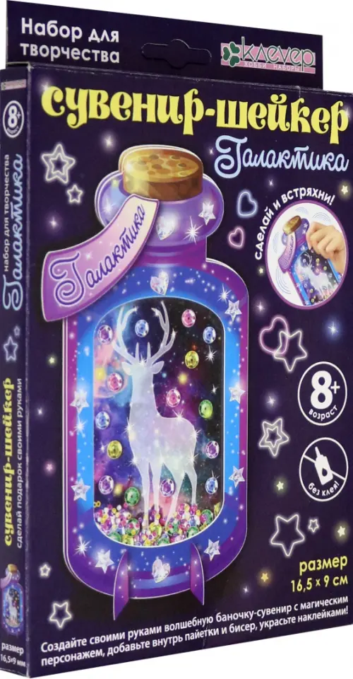 Комплектация: готовые детали из картона и пластика, пайетки, бисер, двусторонние клейкие объёмная и тонкая ленты (скотч), пошаговая инструкция на упаковке. Баночка с волшебными персонажами - прекрасный сувенир, созданный и декорированный своими руками! С набором "Галактика" маленький творец старше 8 лет сам изготовит уникальную баночку-шейкер. Яркая картонная баночка—арт-объект со сказочно-прекрасным полупрозрачным образом оленя, переливающимися пайетками и сверкающим бисером внутри, ярлычком с названием на "крышке" украшена фигурными голографическими стикерами. Ребёнок наклеит пайетки, насыплет пайетки и бисер на одну часть баночки, наклеит пластик-окошко, склеит две детали баночки и, украсив стикерами, поместит на подставку.