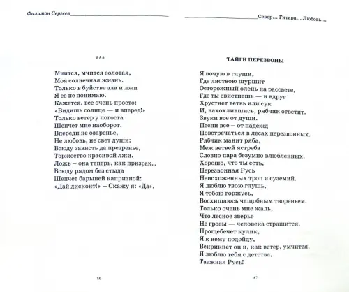 В книгу вошли стихи двух известных русских поэтов - Филимона Сергеева и Ольги Версе. У каждого своя поэтическая тропа, но как часто эти тропы пересекаются! Для поэтов характерно трепетное, внимательное отношение к людям, близким, друзьям, к России, ее прошлому и будущему. Любовь, искренняя и светлая, - основная тема их творчества. Не случайно многие стихи стали песнями. Эта книга - истинное откровение для любителей современной поэзии.