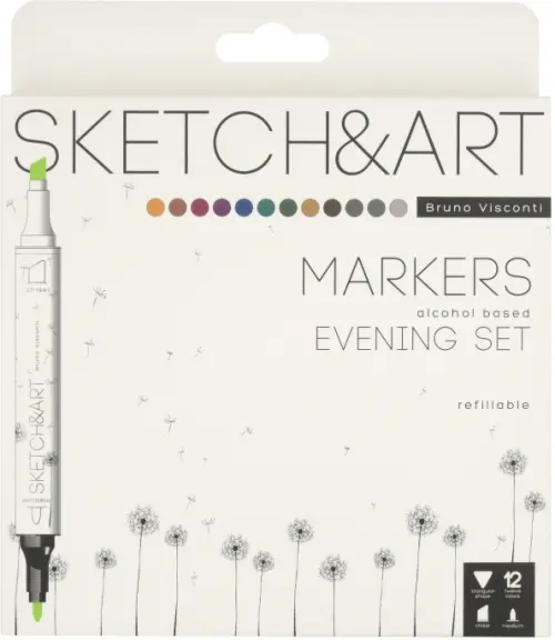 Великолепный набор скетч-маркеров Sketch&Art. Вечерний набор. В белой картонной коробке с покрытием SoftTouch подобраны 12 оттенков двусторонних маркеров для рисования закатов, прорисовки глубоких теней и создания выразительных переходов.
