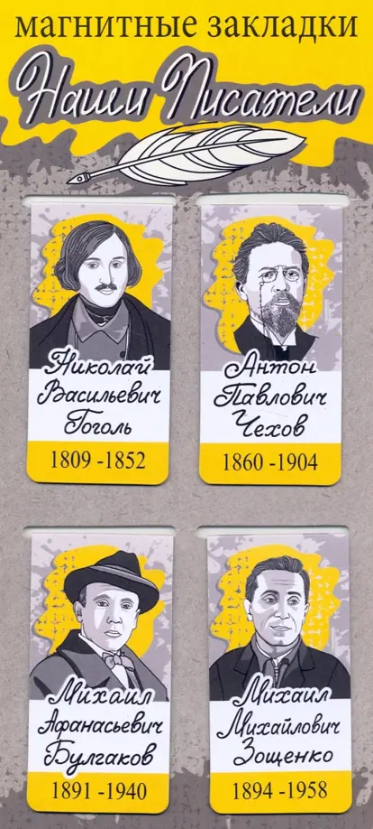 Закладки магнитные Наши писатели: Гоголь, Чехов, Булгаков, Зощенко, 35х70 мм, 4 штуки