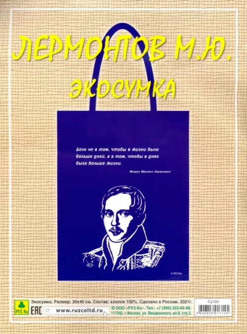 Замечательную сувенирную сумку для всех увлеченных российской классической литературой и поэзией приготовило издательство "Руз Ко". Изображен портрет М. Лермонтова, сопровождаемый словами: "Дело не в том, чтобы в жизни было больше дней, а в том, чтобы в днях было больше жизни". Материал приятный на ощупь хлопок. Сумка удобная и ...
