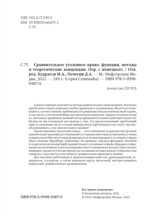 Представленная читателям книга — это толкование и критика построения сравнительно-правовых исследований со стороны известных и уважаемых ученых и директоров Института международного и международного уголовного права Макса Планка (Фрайбург, Германия). На примере анализа функций, способов и теоретических концепций сравнительного уголовного права обращается внимание на негативные аспекты поверхностного отношения к методу. Пристальное внимание уделяется тем критериям, на основании которых можно с уверенностью говорить о научности полученного сравнительно-правового знания.