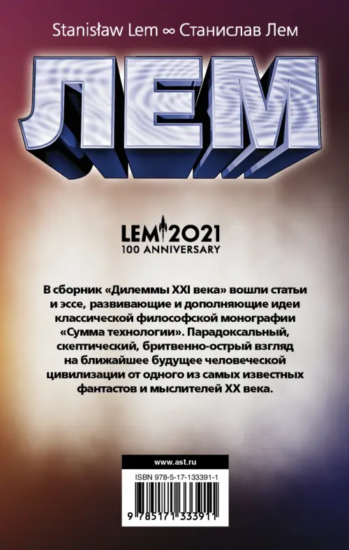 В сборник "Дилеммы XXI века" вошли статьи и эссе, развивающие и дополняющие идеи классической философской монографии "Сумма технологии". Парадоксальный, скептический, бритвенно-острый взгляд на ближайшее будущее человеческой цивилизации от одного из самых известных фантастов и мыслителей ХХ века.