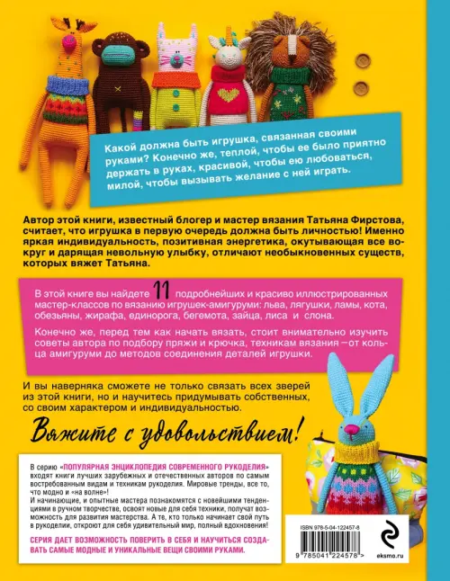 Сэр Мортимер Квакс третий и многие другие… Стоп! А у кого такое роскошное аристократическое имя? Фамилия легко выдает лягушку, но это не главное. Главное, что игрушки автора книги и популярного блогера Татьяны Фирстовой настолько необычные, обладают такой яркой индивидуальностью и энергетикой, что просто невозможно не дать каждой их них красивое имя. А характер у них уже есть! 11 подробных мастер-класса, в которых проиллюстрирован каждый шаг: лев, лама, кот, лягушка, обезьянка, жираф, единорог, бегемот, заяц, лис и слон. Выбрать из них невозможно, каждая игрушка - неповторимая личность. Придется вязать всех! Только сначала стоит изучить инструкции по выбору пряжи и крючка и восстановить в памяти основные техники амигуруми. Открывайте книгу и знакомьтесь с ее яркими персонажами - будущими друзьями ваших детей!