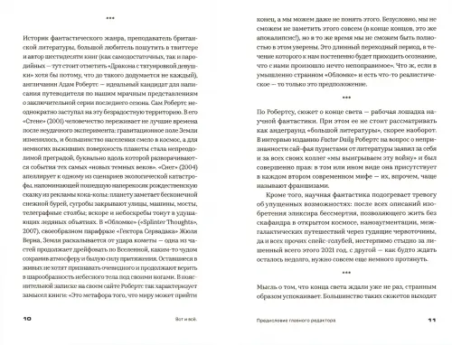 «Вот и всё.» — это блестящий анализ наших представлений о гибели человечества, в которых отражаются состояние общества, психология индивида и масс, их заветные чаяния и страхи. Почему зомби — это мы? Что «Матрица» может сказать об эпидемиях? Кто был первым «последним человеком» на Земле? Робертс чрезвычайно остроумно показывает, как друг на друга влияют научная фантастика и реальность, анализирует возможные сценарии Армагеддона и подбирает убедительные доводы в пользу того, что с ним стоит немного повременить.