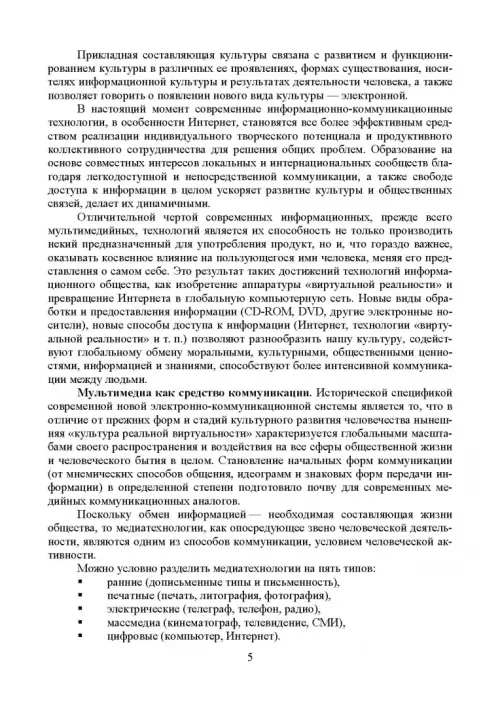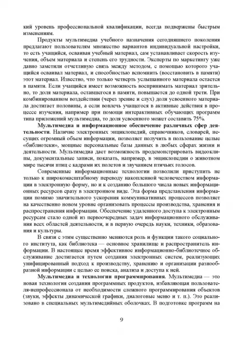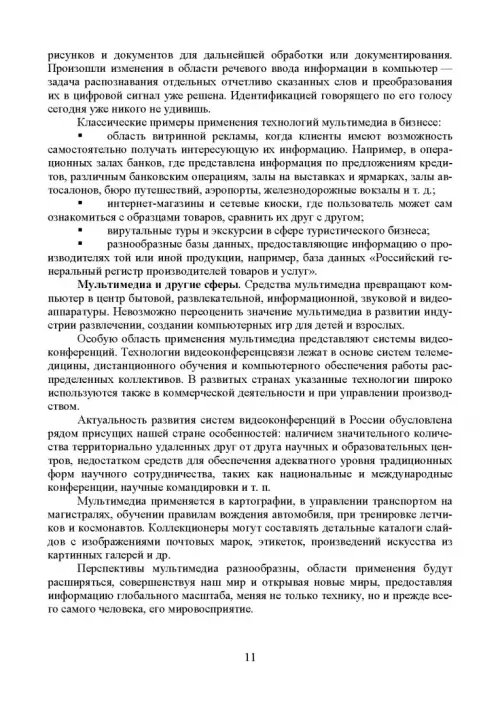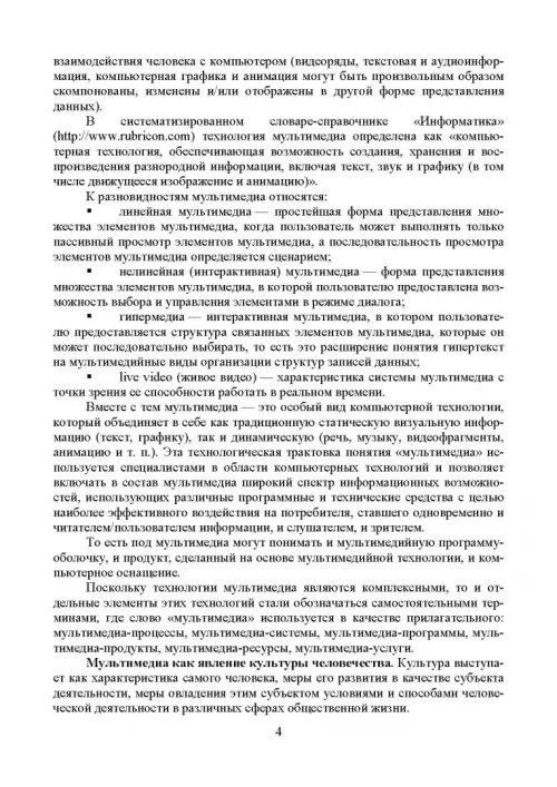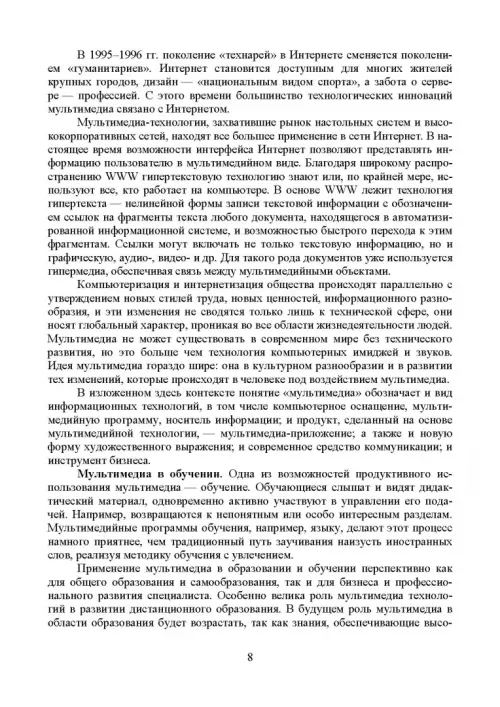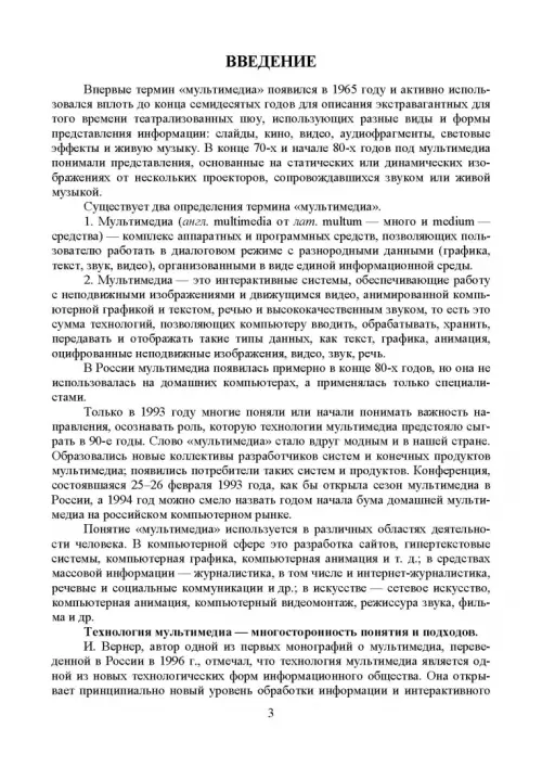 Мультимедиa-технологии являются одним из наиболее перспективных и популярных направлений информатики. Они имеют целью создание продукта, содержащего коллекции изображений, текстов и данных, сопровождающихся звуком, видео, анимацией и другими визуальными эффектами, включающего интерактивный интерфейс и другие механизмы управления. В пособии рассмотрены виды компьютерной графики; описаны проблемы формирования и управления цветом. Значительное внимание уделено таким понятиям, как разрешение и размеры, а также способам сжатия графической информации. Рассмотрены устройства ввода, вывода и отображения информации. В разделах, посвященных работе со звуковой и видеоинформацией, рассмотрены основные свойства слуха и зрения; звуковые сигналы и их цифровое представление; основы телевидения; методы сжатия звуковой и видеоинформации; описаны многоканальные звуковые системы и способы обработки звука. Рассмотрены методы организации видеоконференций.