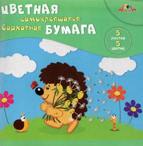 Цветная самоклеящая бархатная бумага "Ежик", А5, 5 листов, 5 цветов