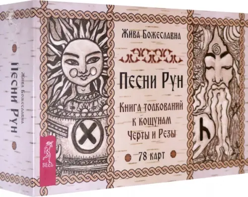 В подарочный набор входит руническая колода из 78 карт в отдельной коробочке (авторские кощуны Черты и Резы) и книга «Песни рун», в которой представлена вся необходимая информация для работы с картами:
