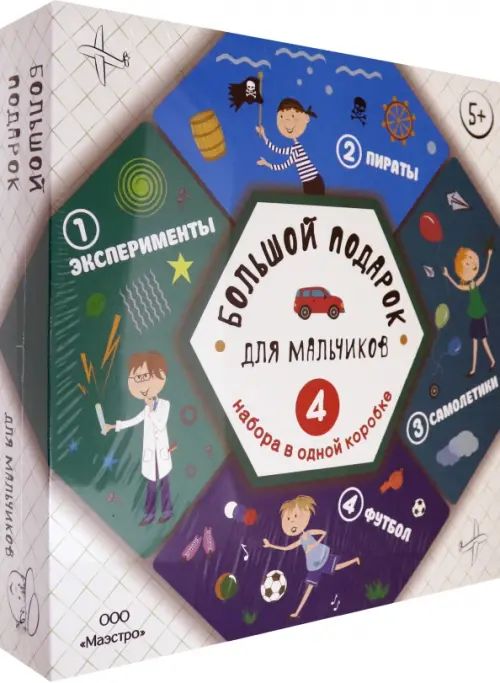 Большой подарок для мальчиков. 4 набора в одной коробке. Эксперименты. Пираты. Самолетики. Футбол