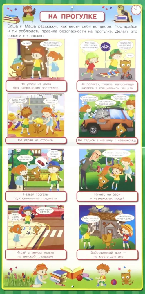 Отличный подарок для любознательных дошколят. Познавательная перекидная книжка станет не только украшением детской комнаты, но и поможет запомнить основные правила безопасного поведения, которые должны знать дети. Красочное пособие большого формата познакомит малышей с азбукой пешеходов, правилами поведения в быту, за пределами дома, в транспорте, на природе. Занятия с книгой позволят привить детям навыки безопасного поведения и основ личной безопасности. Герой книги, котёнок Ой, сталкивается с множеством ситуаций, связанных с опасностью для жизни, учится выходить из них и берёт пример со своих друзей — Маши и Саши.