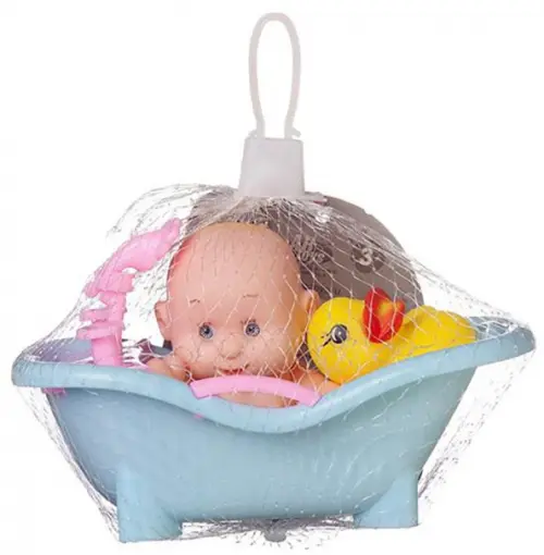 В его состав входят очаровательный пупсик, розовая ванночка с краном и милый желтый утенок.