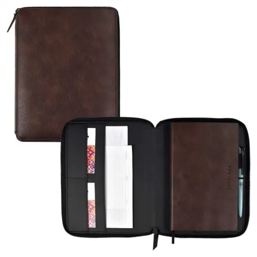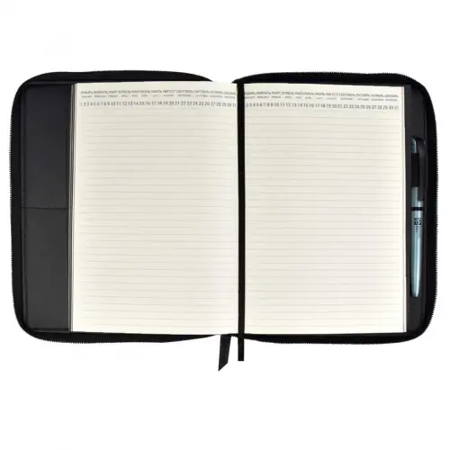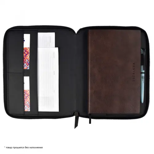 Особенности: папка-органайзер в твёрдом переплёте, ежедневник в мягком переплёте, застёжка "молния", запаянный край, карманы для визиток и документов.
