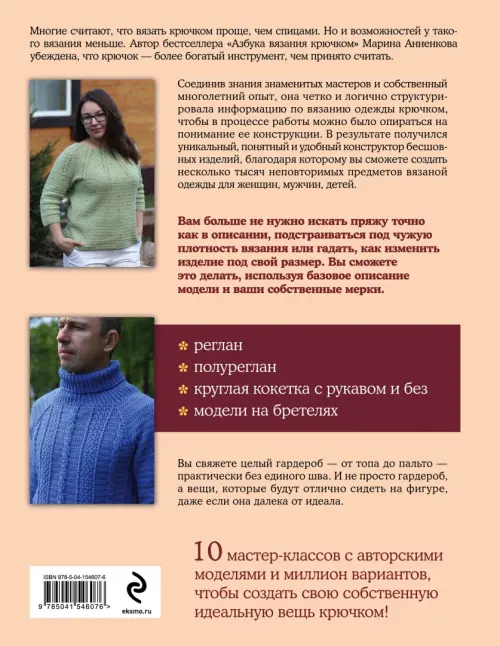 Новая книга автора бестселлера "Азбука вязания крючком" Марины Анненковой продолжает открывать перед вязальщицами новые горизонты и возможности. Четко, последовательно, логично, этот идеально разработанный конструктор бесшовных изделий научит не только создавать авторские модели, представленные в книге, но и разрабатывать собственные: вы сможете превратить детское платье в женский пуловер, топ в свитер, а кардиган в пальто. И все это сядет идеально по фигуре, вашей, вашего ребенка или мужа. Автор камня на камне не оставляет от стереотипного мнения, что вязание крючком проще и беднее идеями и техниками, чем вязание на спицах. Огромное разнообразие моделей, деталей, силуэтов, способов отделки, комбинируя которые, вы свяжете невероятное количество вариантов красивой одежды. Подробные мастер-классы, в которых проиллюстрирован каждый шаг и каждое движение крючка, делают этот необычный конструктор доступным абсолютно всем, даже тем, кто только начинает вязать. А еще вы найдете в книге полезные советы, лайфхаки и такие тонкости, которыми обладают только опытные мастера. Вяжите с удовольствием!
