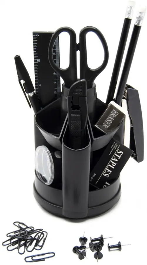 Настольный набор, вращающийся, 13 предметов: два карандаша с ластиком, две ручки, канцелярский нож, точилка, ластик, ножницы, линейка, степлер № 10, силовые кнопки, скобы для степлера № 10, скрепки.