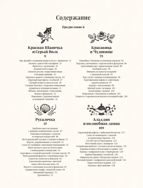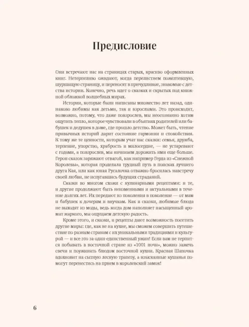 Сказки и рецепты дают возможность посетить другие миры: где, как не на кухне, мы сможем совершить путешествие по разным странам с их уникальными традициями и культурой – и все это за один-единственный ужин! Если вам не терпится побывать в восточной стране из "Алладина и волшебной лампы", можно зажечь свечи и поужинать блюдом восточной кухни. "Красная Шапочка" вдохновит на сытную лесную трапезу, а изысканные блюда помогут перенестись на прием в королевский замок! А что, если вспомнить любимые с детства сказки и совместить их со сказочными рецептами? План таков: сначала вы поудобнее устроитесь на диване и насладитесь волшебными историями, а затем превратите кухню в сказочную страну! В этой книге ореховое жаркое и сытный гуляш сменяются маринованной форелью и карамельным парфе с морской солью. А запеченные персики или сыр - мороженым с базиликом и эспрессо с горячим шоколадом. Изысканно, ярко, вкусно и по-настоящему волшебно!