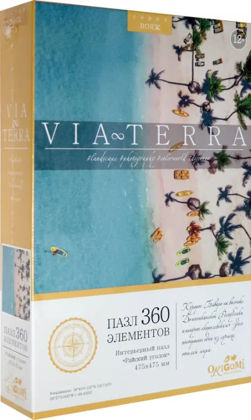 Пазл из 360 элементов "Райский уголок" - это интерьерный пазл, входящий в новую серию Via Terra. Красочные фотографии, взятые за основу серии, захочется собрать и взрослым и детям, а также пазл является отличным украшением любого интерьера! На каждой упаковке можно найти уникальное описание места, изображенного на ней.