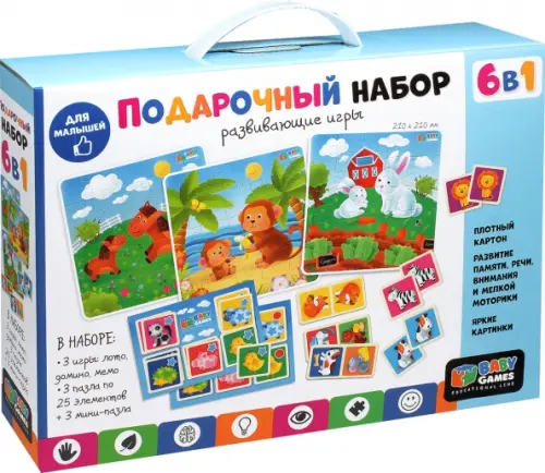 Подарочный набор 6 в 1 - это идеальная система развлечений для вашего малыша. Мы включили в него все самое лучшее - интересные и полезные игры (лото, домино и мемо), а также 6 ярких пазлов с красивыми картинками и знакомыми сюжетами. Дизайн набора выполнен в обновленном стиле линейки продуктов Baby Games - он стал еще современнее и лучше!