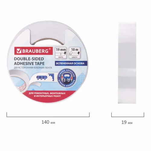Клейкая двухсторонняя лента "Brauberg", 19 мм х 10 м, на вспененной основе, 1 мм, прочная