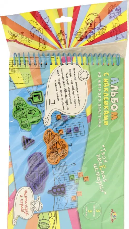 В альбоме: 3 листа мягкого пластика, на которых напечатаны сюжеты и 3 листа с фигурными наклейками.