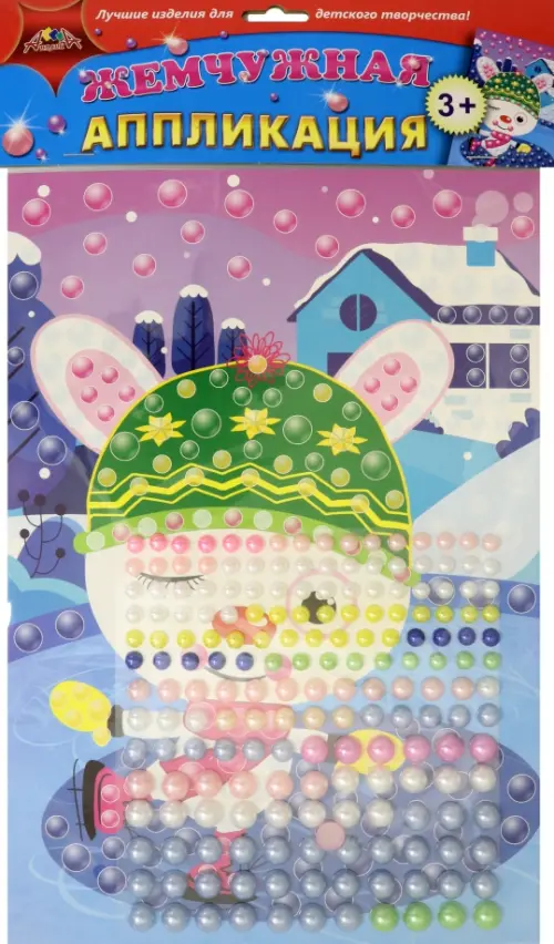 На цветной картонной основе цветом и контуром показаны места, куда необходимо приклеить перламутровые пластмассовые полужемчужены разного цвета и диаметра. Элементы имеют клеевой слой, поэтому вы обойдетесь без клея. В результате получится яркая картинка.