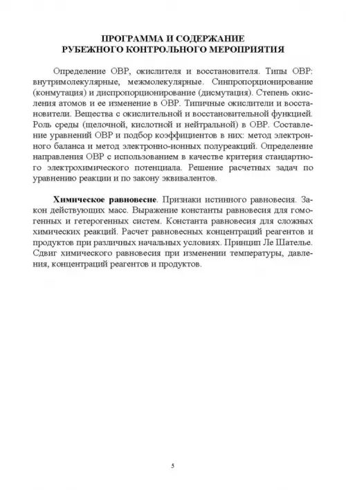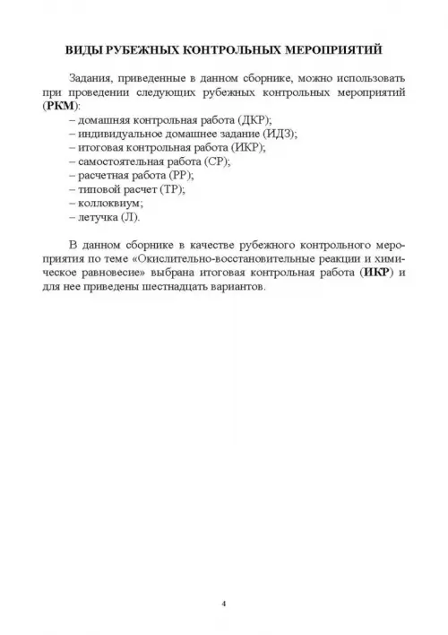 Практическое пособие включает в себя задания, которые могут быть использованы при проведении рубежных контрольных мероприятий (РКМ) по дисциплине «Общая и неорганическая химия» по разделам «Окислительно-восстановительные реакции» и «Химическое равновесие».