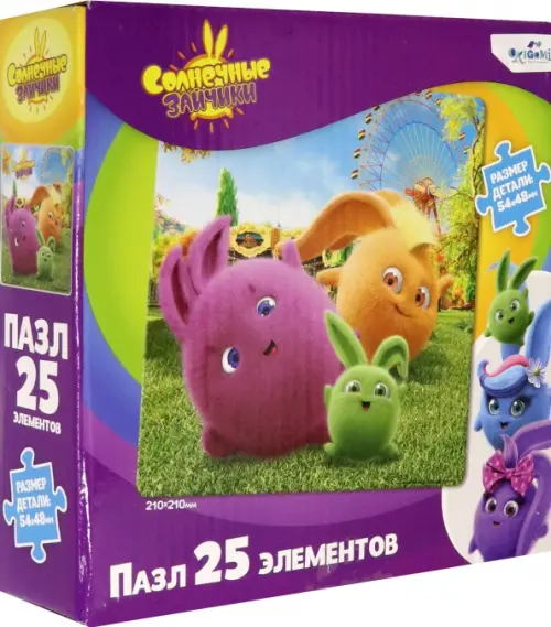 Пазл из 25 элементов, основанный на любимых сюжетах мультфильма "Солнечные зайчики" понравится любому ребенку, а сборка яркой картинки принесет радость не только малышам, но и их родителям.