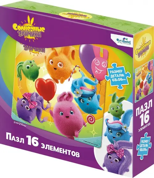 Пазл из 16 элементов, основанный на любимых сюжетах мультфильма "Солнечные зайчики" понравится любому ребенку, а сборка яркой картинки принесет радость не только малышам, но и их родителям.
