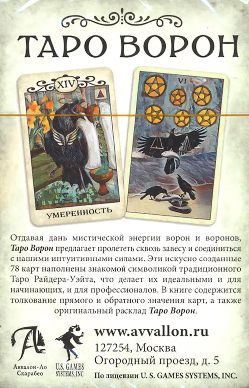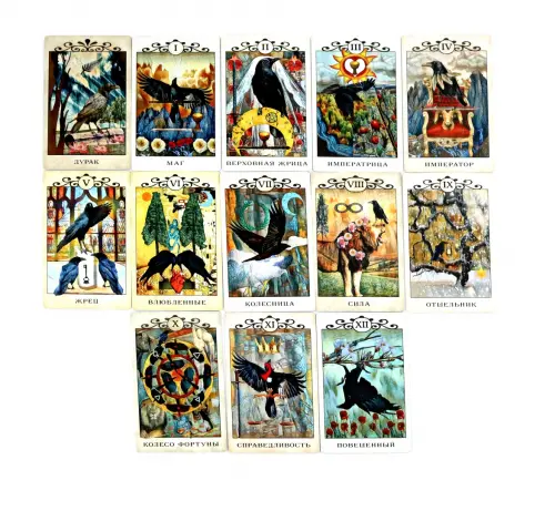 Вороны с давних времен считаются мистическими и мудрыми птицами. Вместе с Таро Ворон вы пролетите через завесу тайны и соединитесь со своей внутренней интуитивной силой. Прекрасно исполненные карты сочетают в себе с традиционный символизм Таро Уэйта, поэтому они являются идеальным инструментом предсказания и для новичков, и для профессиональных тарологов. В инструкции вы найдете значения карт в прямом и перевернутом положении, а также оригинальный расклад для этой колоды.