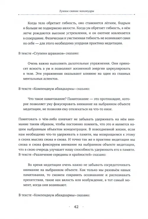 Текст «Лунное сияние махамудры» составлен как руководство по практике. Как начинающим нам лучше выполнять практику махамудры последовательно — шаг за шагом. Однако следует помнить: сущность этой практики заключается в постижении того, что тот, кто выполняет практику медитации, и сама эта практика медитации нераздельны. Обычно мы воспринимаем духовный путь как некий процесс систематического устранения своих недостатков и развития позитивных качеств, который приведёт нас к желаемой цели. В рамках традиции махамудры недостатки и достоинства не считаются чем-то отдельным от практикующего. Практика духовного пути и тот, кто по этому пути следует, являются одним и тем же. В этом и заключается сущность данного учения.