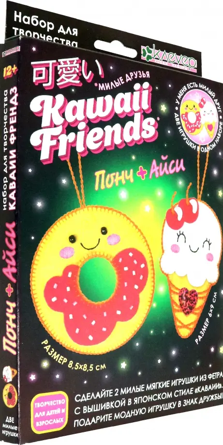 Серия «Каваии-Френдз» - это милые мягкие мини-игрушки, выполненные в популярном японском стиле "каваии" из цветного фетра с очаровательными мордашками. Взрослые и дети старше 12 лет с увлечением создадут две набивные игрушки: вышьют мордашки, склеят с помощью скотча небольшие детали, сошьют заготовку по периметру, наполнят её синтепухом и обошьют декоративным шнуром. Результат работы - дружелюбные авокадо "Ави" и яишенка "Яя" — чудо, сделанное своими руками!