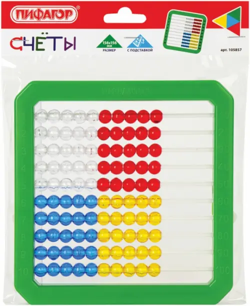 Счеты детские "Учись считать!" представляют собой пластиковый корпус с дугами, на которых закреплены бусины разного цвета. В каждом ряду 10 бусин двух цветов. Всего десять рядов, напротив которых указаны номера каждого ряда. Упаковка - пакет с европодвесом.