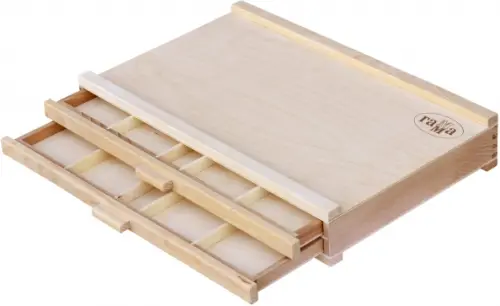 Сохраняет порядок на рабочем месте и не позволяет мелкам крошиться и осыпаться. Этюдник оснащён 2-мя выдвижными лотками с разделителями на зоны для сортировки мелков по типам и цветам.