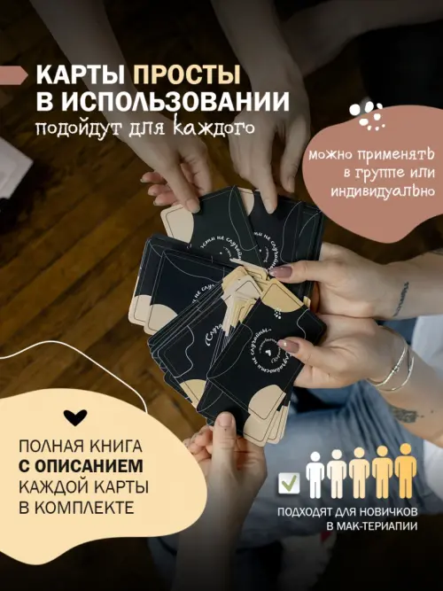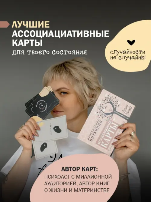 «Ассоциативные карты» — не имеющие аналогов авторские карты, разработанные Лизой Мокой, известным блогером с миллионной аудиторией, создательницей уникальных проектов для женщин и мамой пятерых детей. На каждой карте размещена простая фраза, которая поможет принять решение в трудной ситуации, настроиться на грядущий день, услышать собственную интуицию и получить ответы на непростые вопросы. Каждая карта содержит поддерживающее послание от Лизы Моки, помогающее раскрыть смысл фразы.