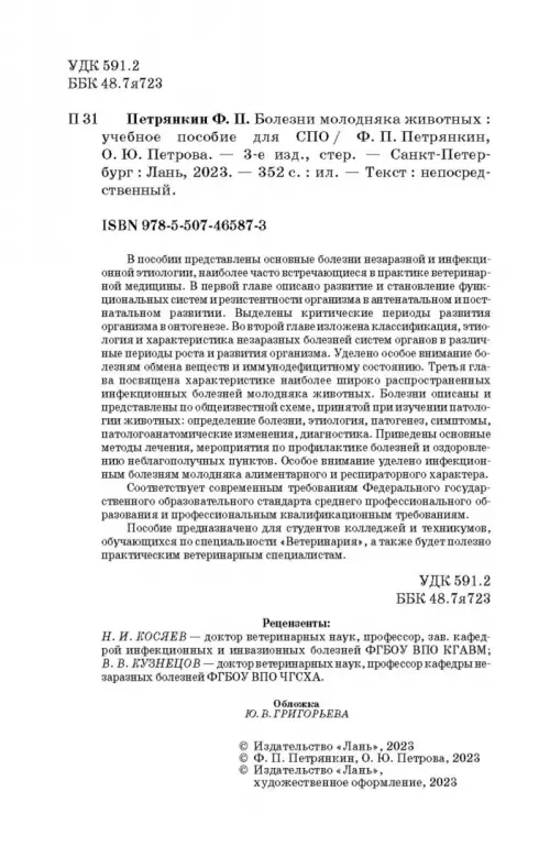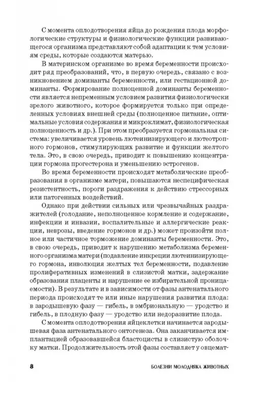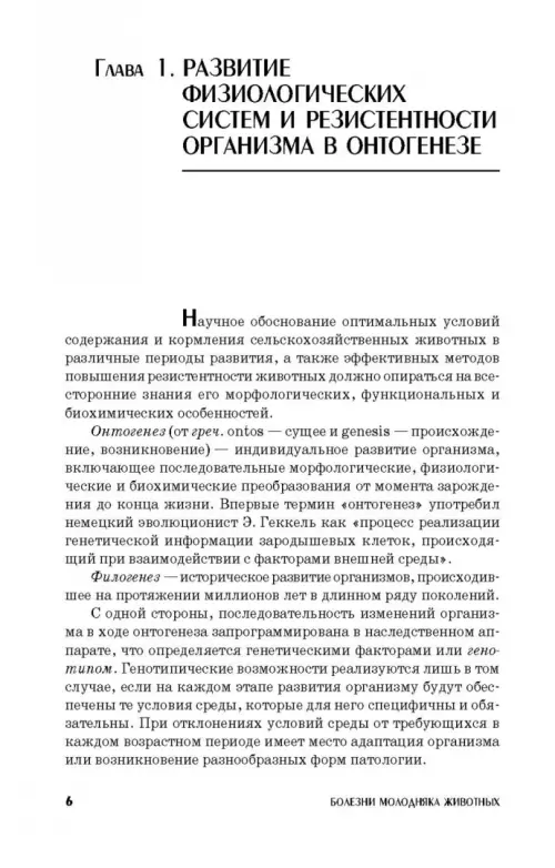 В пособии представлены основные болезни незаразной и инфекционной этиологии, наиболее часто встречающиеся в практике ветеринарной медицины. В первой главе описано развитие и становление функциональных систем и резистентности организма в антенатальном и пост-натальном развитии. Выделены критические периоды развития организма в онтогенезе. Во второй главе изложена классификация, этио-логия и характеристика незаразных болезней систем органов в различные периоды роста и развития организма. Уделено особое внимание болезням обмена веществ и иммунодефицитному состоянию. Третья глава посвящена характеристике наиболее широко распространенных инфекционных болезней молодняка животных. Болезни описаны и представлены по общеизвестной схеме, принятой при изучении патологии животных: определение болезни, этиология, патогенез, симптомы, патологоанатомические изменения, диагностика. Приведены основные методы лечения, мероприятия по профилактике болезней и оздоровлению неблагополучных пунктов. Особое внимание уделено инфекционным болезням молодняка алиментарного и респираторного характера. Пособие предназначено для студентов колледжей и техникумов, обучающихся по специальности «Ветеринария», а также будет полезно практическим ветеринарным специалистам.