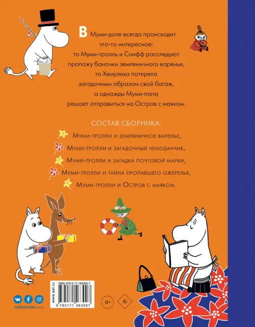 "Муми-тролли и Приключения в Муми-доле" - это весёлый сборник, куда вошли 5 историй: "Муми-тролли и земляничное варенье", "Муми-тролли и загадочный чемоданчик", "Муми-тролли и загадка почтовой марки", "Муми-тролли и тайна пропавшего ожерелья", "Муми-тролли и Остров с маяком".