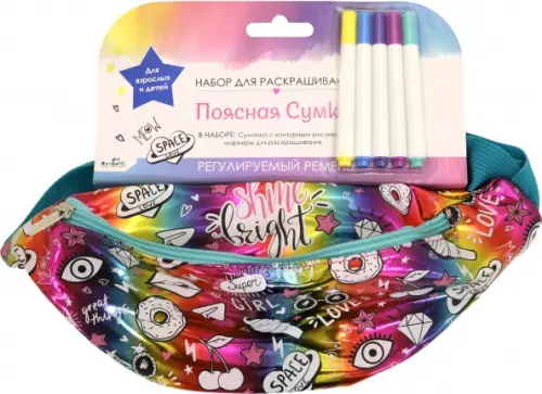 Яркий галактический дизайн и модный формат поясной сумки с регулируемым ремешком понравится и детям, и взрослым. Сумочка сделана из блестящей голографической ткани в самых космических оттенках! Водостойкие маркеры защитят сумку от любой непогоды, с их помощью легко и просто создать уникальный, стильный аксессуар своими руками!