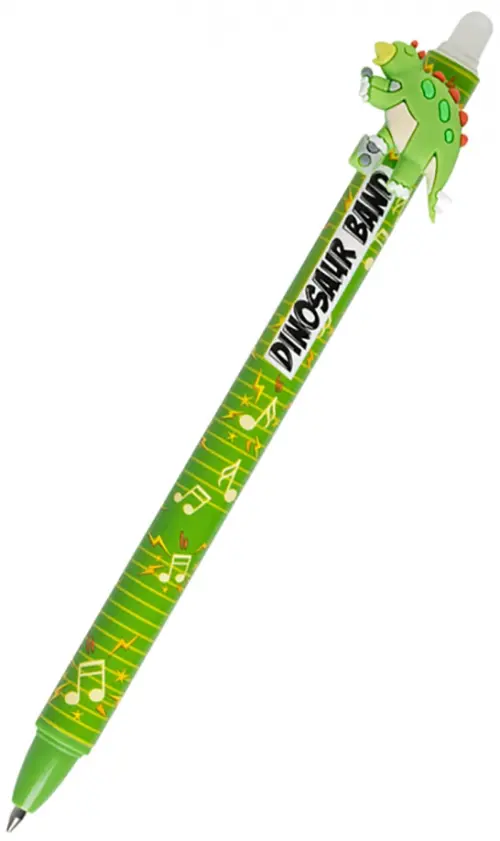 Изделие обладает необычным дизайном: кнопочный механизм ручки украшен игрушечным динозавром.