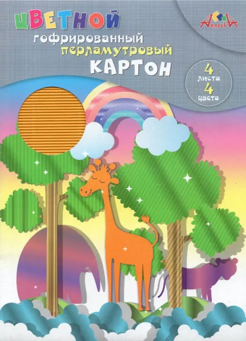 Цветной гофрированный перламутровый картон "Жираф", А4, 4 цвета, 4 листа