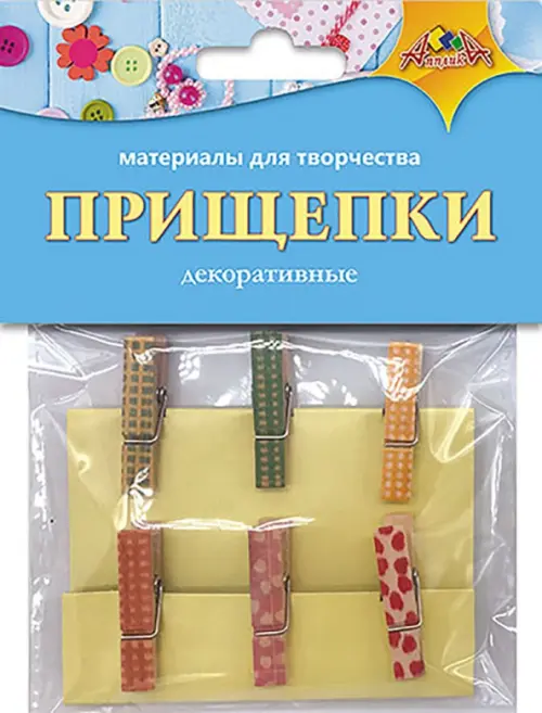 В наборе деревянные цветные прищепки с приклеенными фигурками. Количество таких прищепок 6 штук.