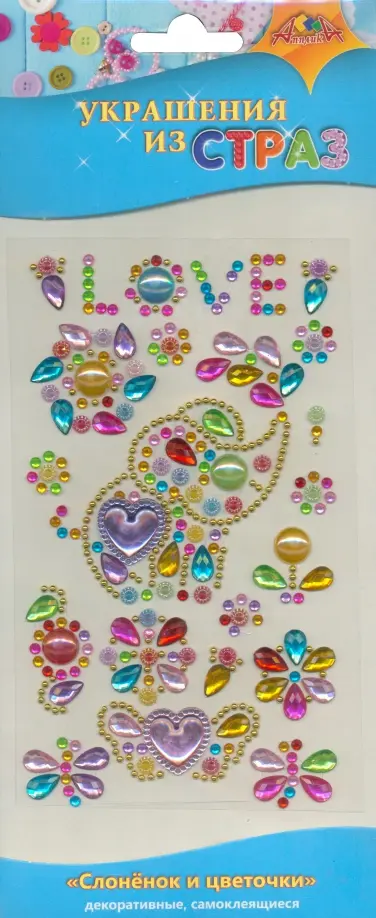 В каждом наборе фигурки определенной цветовой гаммы. Фигурки легко отделяются от подложки и могут быть приклеены на гладкую ровную поверхность. В качестве декора можно использовать и отдельные стразы.