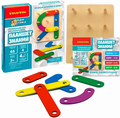 В комплект входят: деревянные детали, подставка, книжка с заданиями.