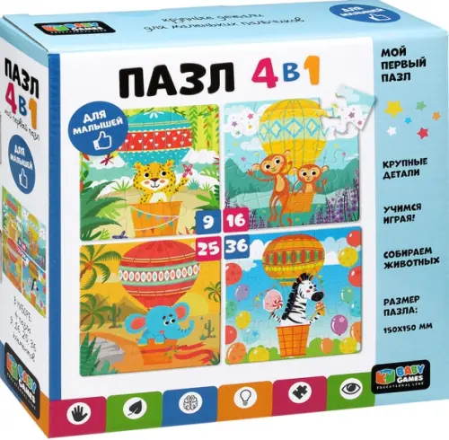 Набор пазлов 4 в 1 - это комплект пазлов с разной элементностью, включающий в себя головоломки из 9, 16, 25 и 36 элементов, объединенных общей тематикой. Набор пазлов Baby Games "На большом воздушном шаре" содержит необычную коллекцию картинок, которая понравится любому ребенку. Постепенно усложняя сборку пазла от 9 элементов до 36 элементов, ребенок научится внимательности, концентрации, а также сможет развить мелкую моторику.