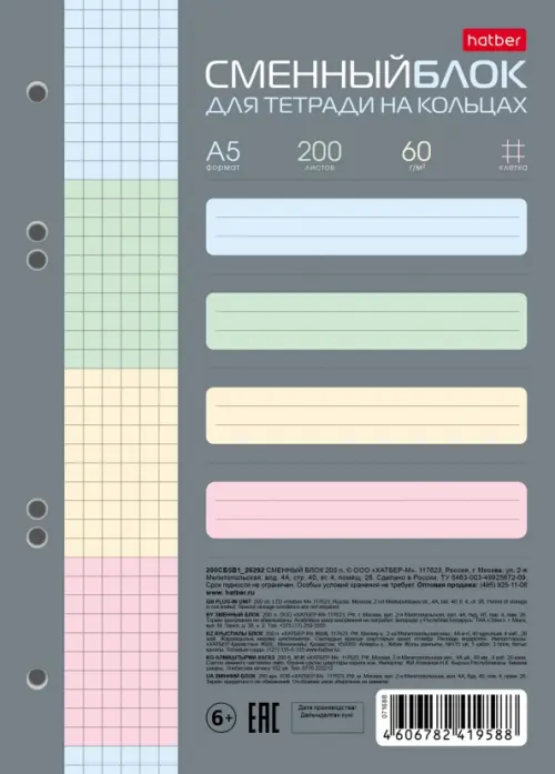 Сменный блок для тетрадей на кольцах А5 формата. Количество листов: 200. Блок: 4-х цветный тонированный, офсет 60 гр. Линовка: клетка, универсальная перфорация на 8 отверстий. Упаковка: индивидуальная в термоусадочную пленку. Предназначен для тетрадей и папок на кольцах. Подходит для использования всех видов пишущих принадлежностей, включая гелевые, капиллярные и перьевые ручки. Сменные блоки ТМ Hatber российского производства отпечатаны на современном высокотехнологичном оборудовании и соответствуют стандартам качества.