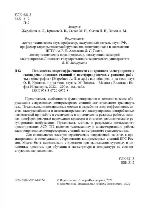 Для специалистов электроэнергетических направлений, занятых в проектировании и эксплуатации оборудования компрессорных станций ЕГС России. Может быть использовано студентами при выполнении курсовых и дипломных проектов, при обучении в магистратуре и аспирантуре по соответствующим направлениям.